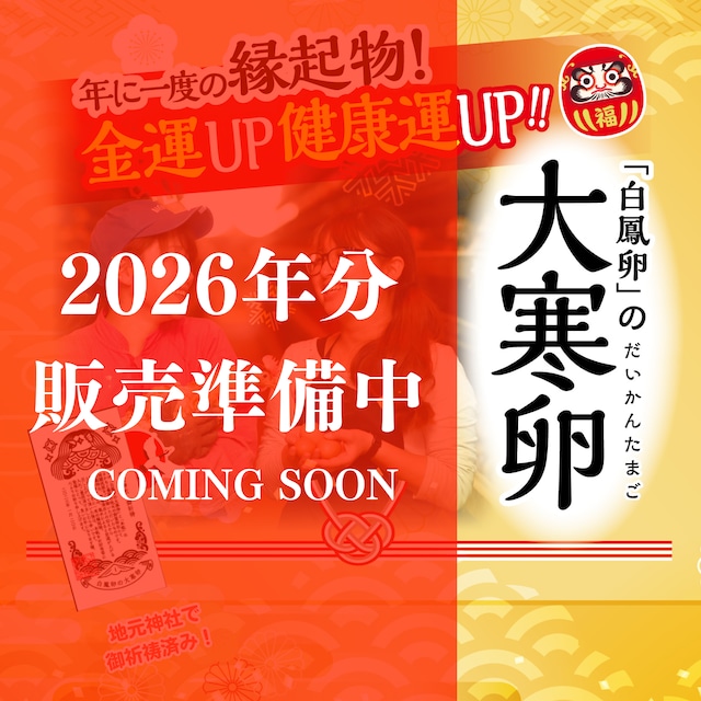 ================== 【必ずご確認ください】 大寒卵 専用販売ページです ================== ※ご購入前に【商品画像を右へスライド】して、 注意事項・お届けについての詳細を必ずご確認ください。 こちらは《大寒卵》の販売ページです。 食品・期間限定商品のため、 下記内容をすべてご了承のうえご購入をお願いいたします。 ━━━━━━━━━━━━━━━━━━━ ▼ ご購入前に必ずご確認ください【重要】 ━━━━━━━━━━━━━━━━━━━ ・お届け日の指定はできません ・ご注文後の住所変更はできません ・期限内に受け取れない場合、返金・再発送はできません ━━━━━━━━━━━━━━━━━━━ ▼ 大寒卵とは(年に一度の縁起物) ━━━━━━━━━━━━━━━━━━━ 大寒は、暦の上で一年で一番寒くなる日。 2026年の「大寒」は【1月20日】です。 この日に産まれた卵「大寒卵」は、 ・栄養満点 ・健康を呼び込む ・金運が上がる と古くから伝えられている、年に一度の縁起物です。 今年も、地元・御霊神社でご祈祷した 【御札】をたまごと一緒に同梱いたします。 ***御祈祷の様子・お客様のお声 https://www.instagram.com/stories/highlights/18040643521313258/ ━━━━━━━━━━━━━━━━━━━ ▼ お受け取りについて【最重要】 ━━━━━━━━━━━━━━━━━━━ 食品のため、 必ず【保管期限内】にお受け取りください。 出荷後、期限内にお受け取りいただけなかった場合、 食品の特性上、商品は返送または廃棄となります。 その場合、 原則として【返金・再発送は承っておりません】。 ※出荷完了後、 追跡番号付きの出荷完了メールをお送りします。 必ずご確認ください。 ━━━━━━━━━━━━━━━━━━━ ▼ お届けについて ━━━━━━━━━━━━━━━━━━━ ■出荷期間 1月20日(火)〜1月26日(月)の間に 順次当店より出荷いたします。 ※出荷後1〜2日後到着が目安です ■お届け日の指定について ・お届け日の指定はできません ・「いつ届きますか?」などの 個別お問い合わせには対応できません ※年に一度の一斉出荷商品のため、 個別対応ができかねます。ご了承ください。 ■時間指定について 時間指定は可能です。 備考欄にご記載ください。 午前中(8〜12時) 12〜14時 14〜16時 16〜18時 18〜20時 19〜21時 ━━━━━━━━━━━━━━━━━━━ ▼ ご住所について【重要】 ━━━━━━━━━━━━━━━━━━━ ご注文後の住所変更はできません。 出荷完了後、追跡番号を元にご自身でご変更をお願いしたします。 ご注文時に、 ・住所 ・郵便番号 ・電話番号 を必ずご確認ください。 ※特にお引越し後の登録住所にご注意ください ━━━━━━━━━━━━━━━━━━━ ▼ 商品・配送について ━━━━━━━━━━━━━━━━━━━ ■たまごについて 賞味期限(生食) 【2026/2/10】 ■保存方法 冷蔵庫(10℃以下)保存 賞味期限経過後や殻にヒビがある卵は、 十分に加熱してお召し上がりください。 ■配送方法 ・ゆうパックでのお届け ・常温/チルド配送を選択可能 ━━━━━━━━━━━━━━━━━━━ ▼ さかもと養鶏の白鳳卵について ━━━━━━━━━━━━━━━━━━━ 白鳳卵は、卵特有の臭みがなく、 コクと甘みがしっかり感じられる卵です。 「おいしい卵は、健康な鶏から」をモットーに、 餌・水・換気・体重管理を徹底し、 新鮮なたまごのみを全国へお届けしています。 ━━━━━━━━━━━━━━━━━━━ ▼ 売り切れの場合 ━━━━━━━━━━━━━━━━━━━ 数量限定のため、売り切れ次第終了となります。 ・大寒卵 商品一覧 https://hakuhouran.theshop.jp/p/00005 ・大寒卵を逃した方へ 1月〜2月初旬は「寒卵」として販売しています https://hakuhouran.theshop.jp/p/00006 ━━━━━━━━━━━━━━━━━━━ ▼ お客様の声 ━━━━━━━━━━━━━━━━━━━ https://sakamoto-yokei.com/customer_voice/